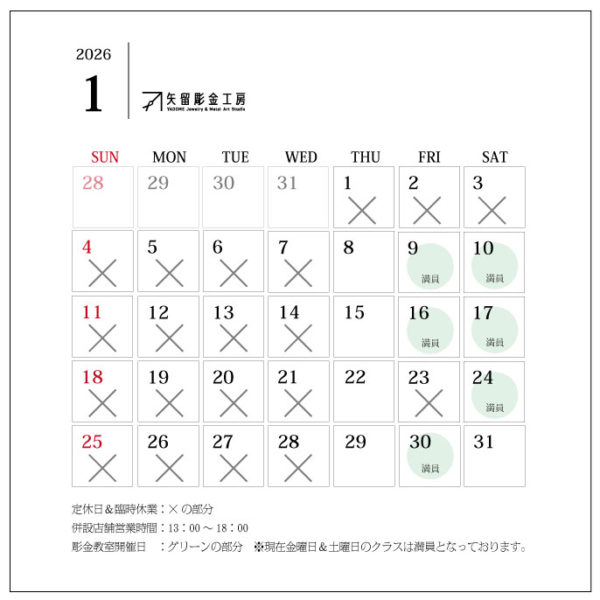 【矢留彫金工房】2026・1月営業日